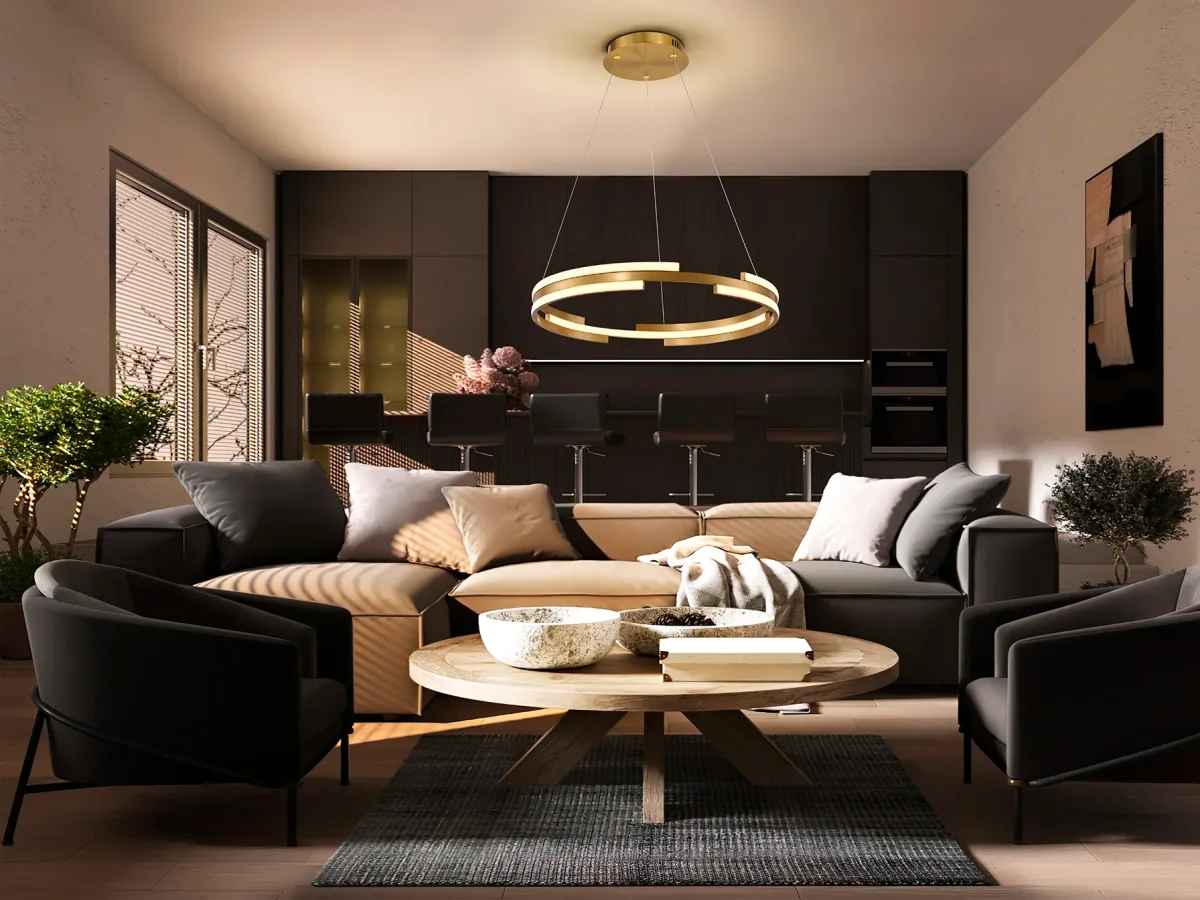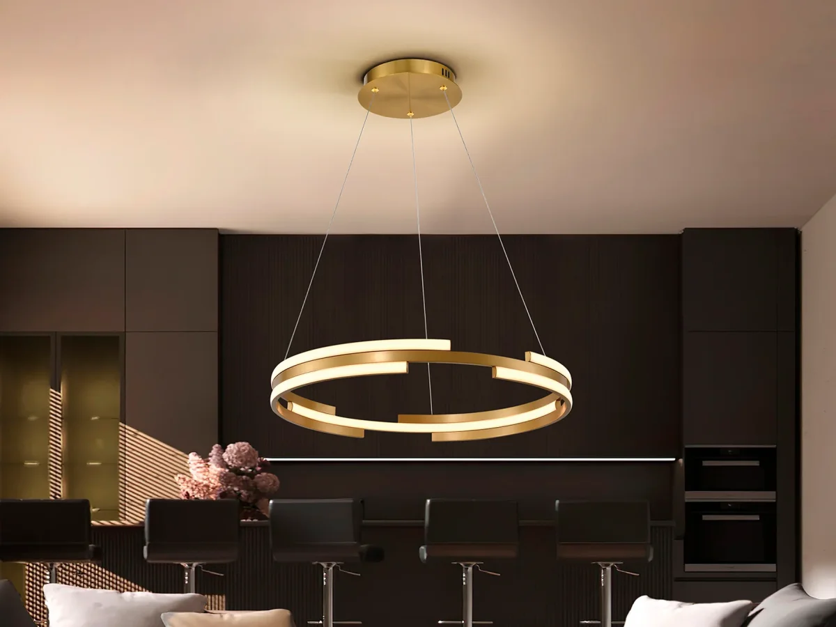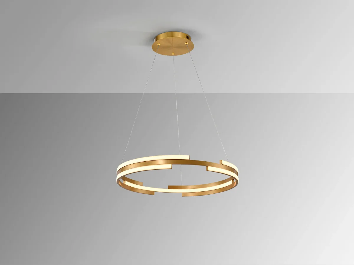 Lámpara realizada en metal y aluminio acabado dorado. Difusor de silicona opal. 52W LED. 3.800 lm. 3.000 K. DIMABLE.