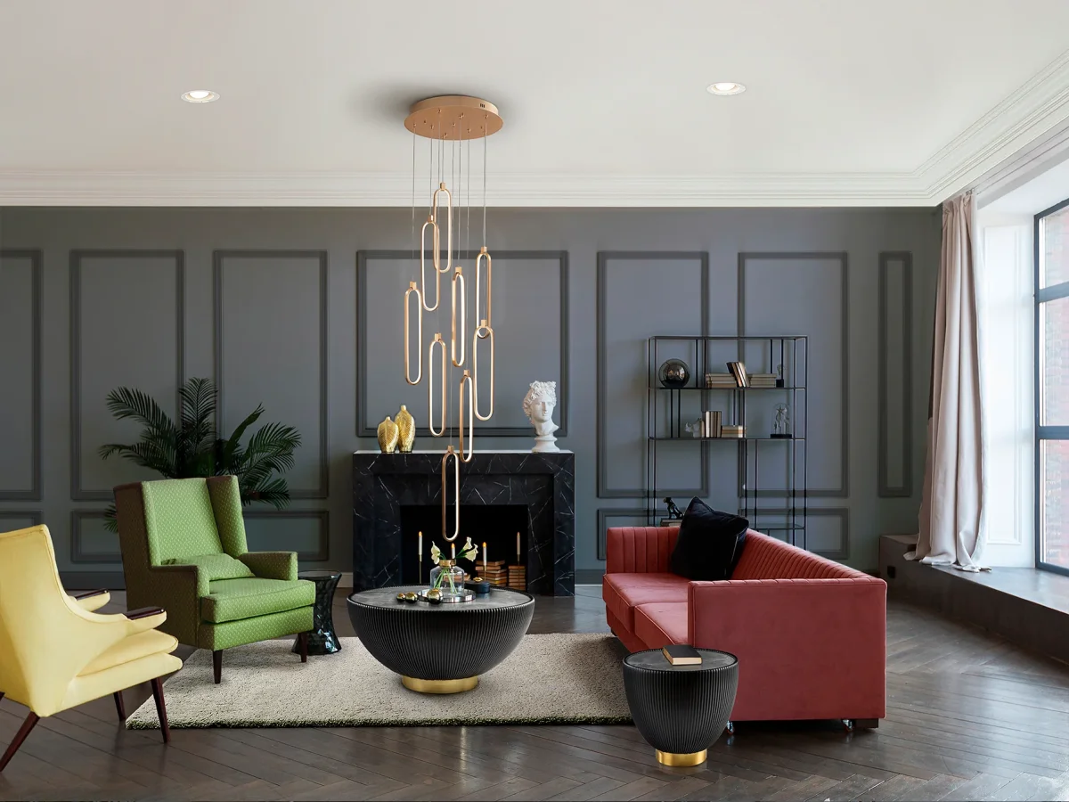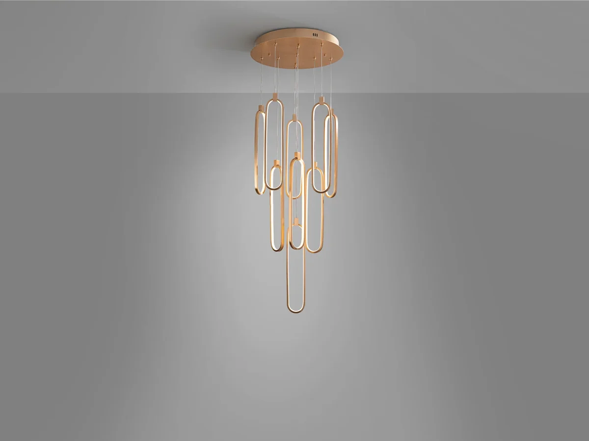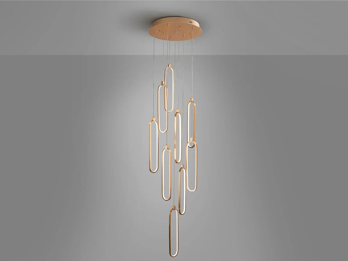 Lámpara LED de 9 luces, realizada en aluminio cepillado, acabado oro rosa. Regulable en altura. Difusores de silicona opal. 117W LED, 5.600 lm, 3.000 K. Dimable.