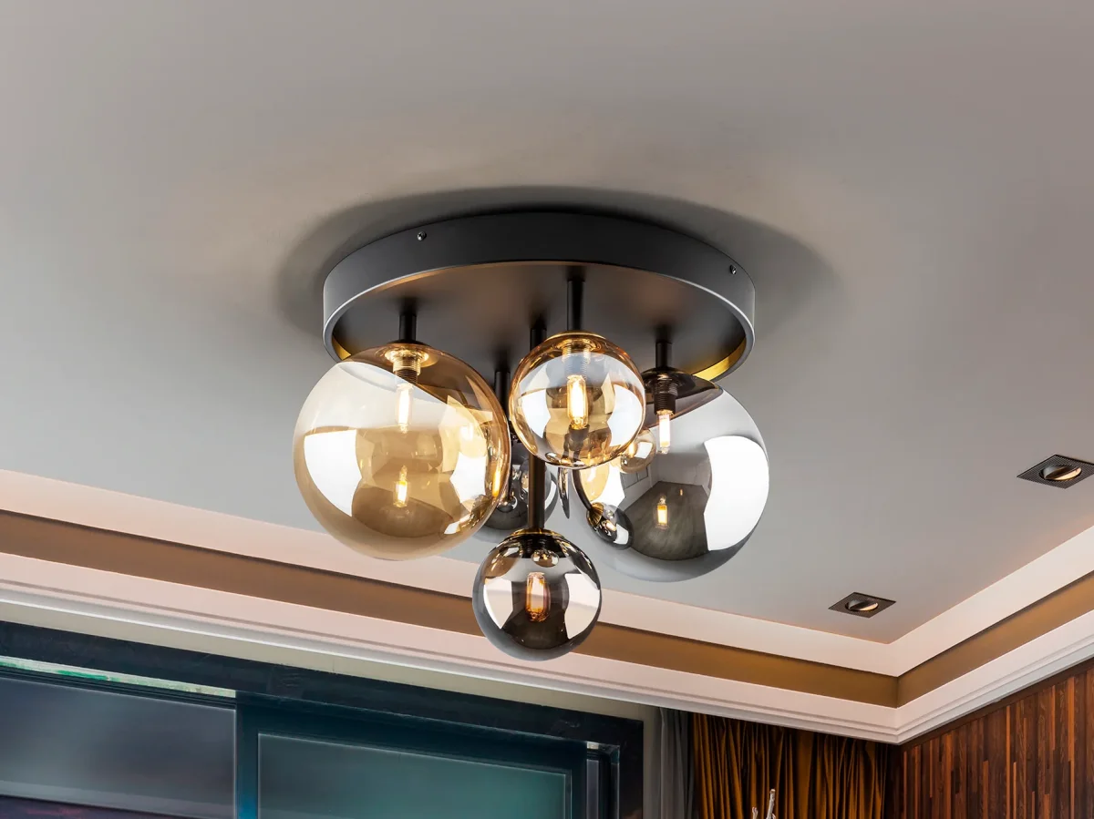 Plafón de techo de 5 luces realizada en metal acabado negro mate, con detalles de latón satinado. Tulipas de cristal esféricas de 12 y 20 cm, en acabados ambar y gris smoke espejado.