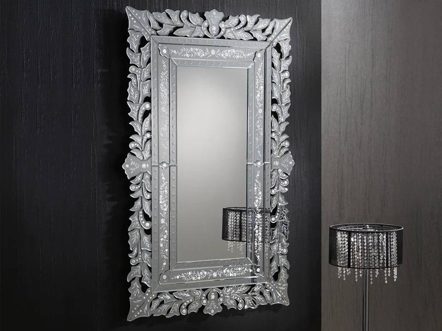 Espejo con marco de lunas biseladas y talladas. Soporte en DM, acabado en negro. Preparado para colgar en posición horizontal o vertical. Luna central biselada.