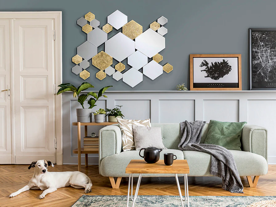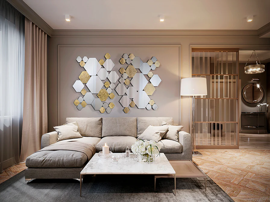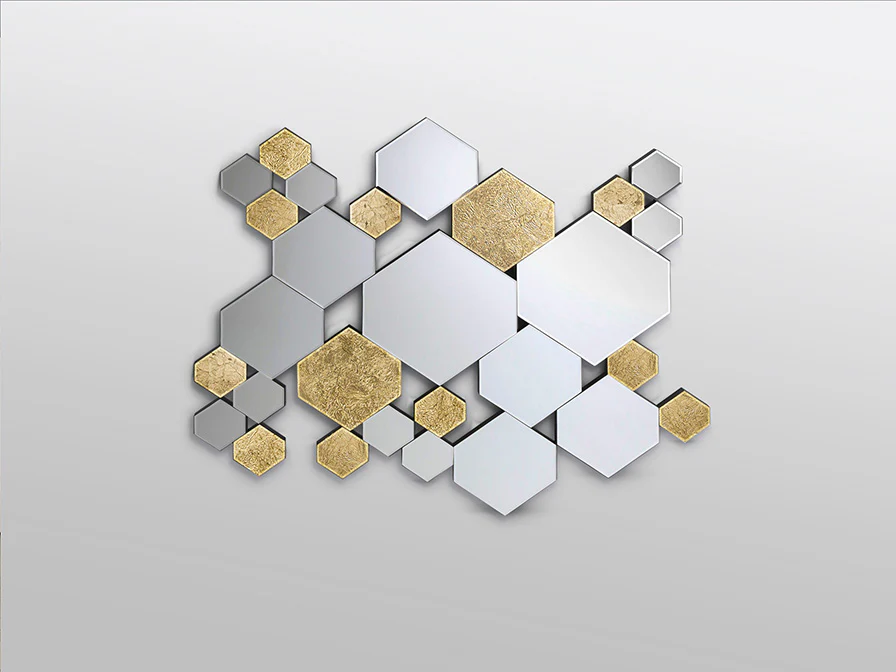 Espejo formado por hexágonos de lunas y cristales con fondo en PAN DE ORO, biselados. Trasera de DM lacado en negro. Preparado para colgar en posición horizontal o vertical.