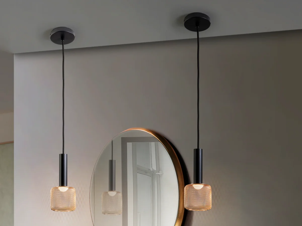 Lámpara LED de 1 luz realizada en metal negro mate y tulipa de malla metálica oro brillo,difusor acrílico opal . 5W LED, 450 lm, 3.000 K. DIMABLE.