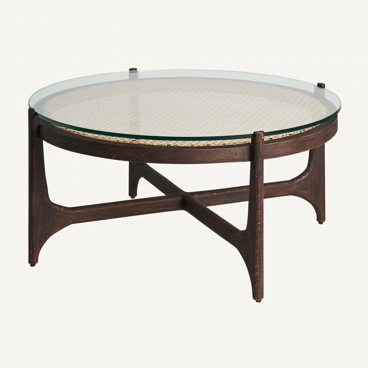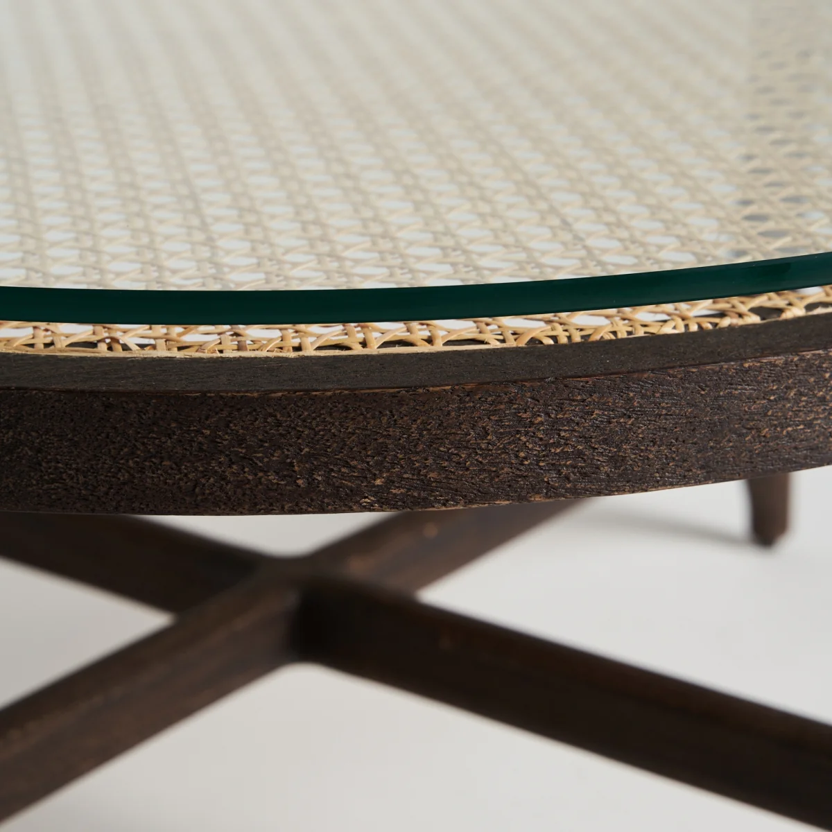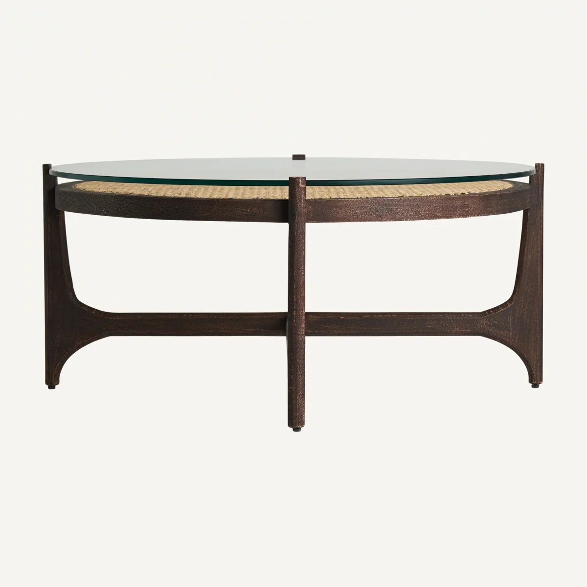 Mesa De Centro Nossen, En Color Marrón, De Estilo Colonial. Fabricado En Madera De Mango, Combinado Con Vidrio Y Ratán.