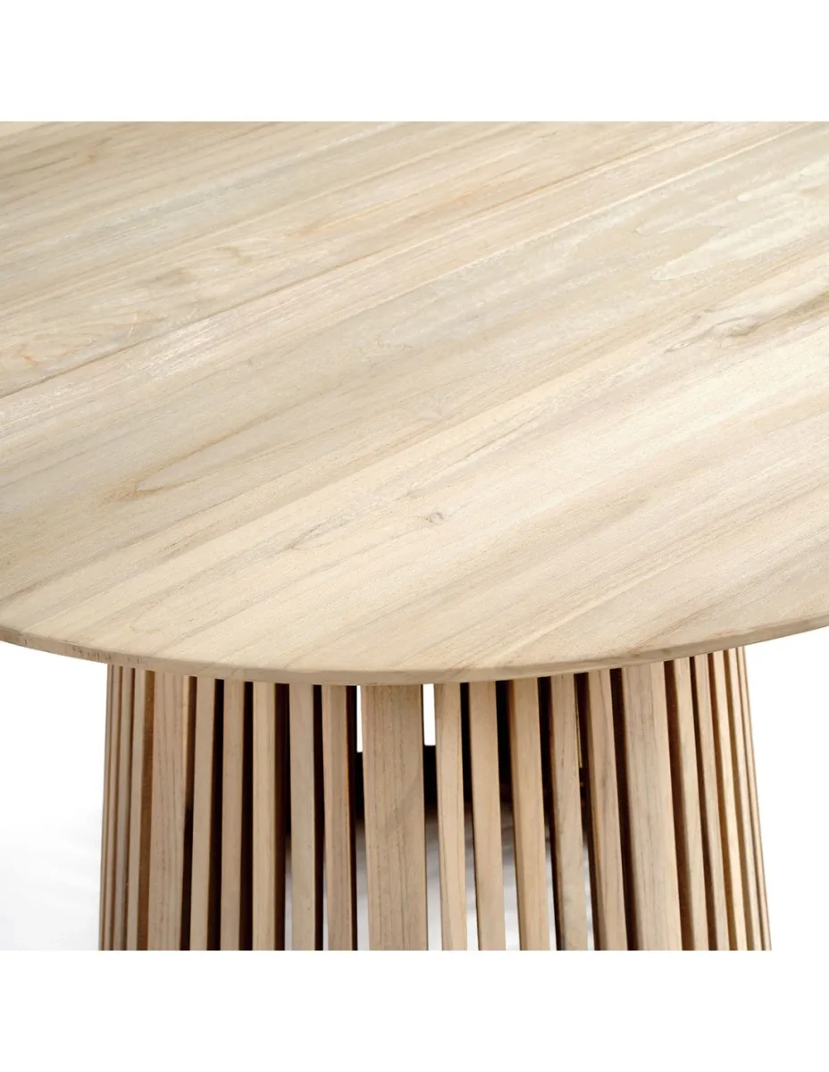 Mesa de comedor redonda para exterior: Fabricada en madera de teca envejecida con base central de palillería. También disponible en diferentes medidas para mesas de centro y auxiliares. Dimensiones: 120x120x76,5