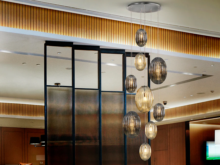 Lámpara de 9 luces, realizada en metal acabado cromo. Tulipas combinadas: grandes y pequeñas. Dos tonos de cristal: coñac y gris smoke espejado . Regulable en altura.