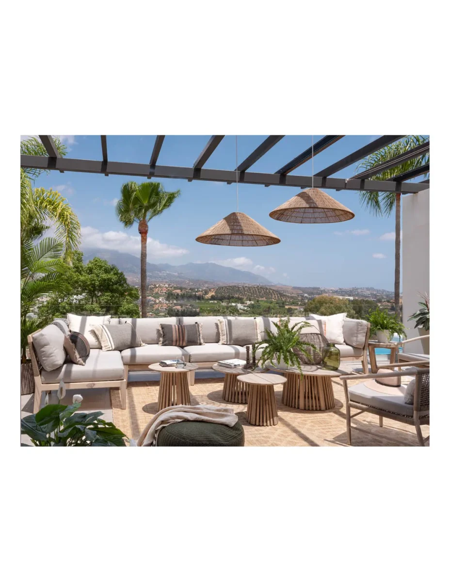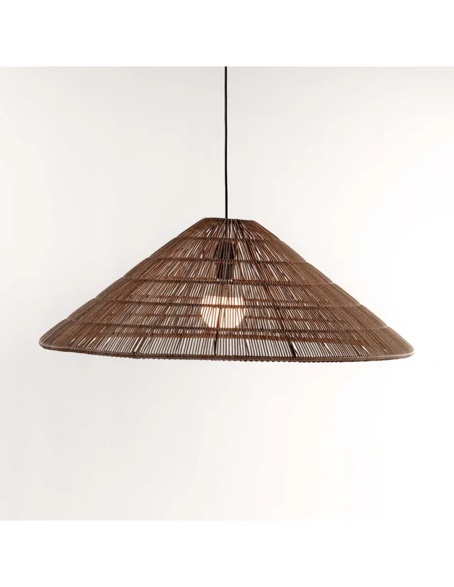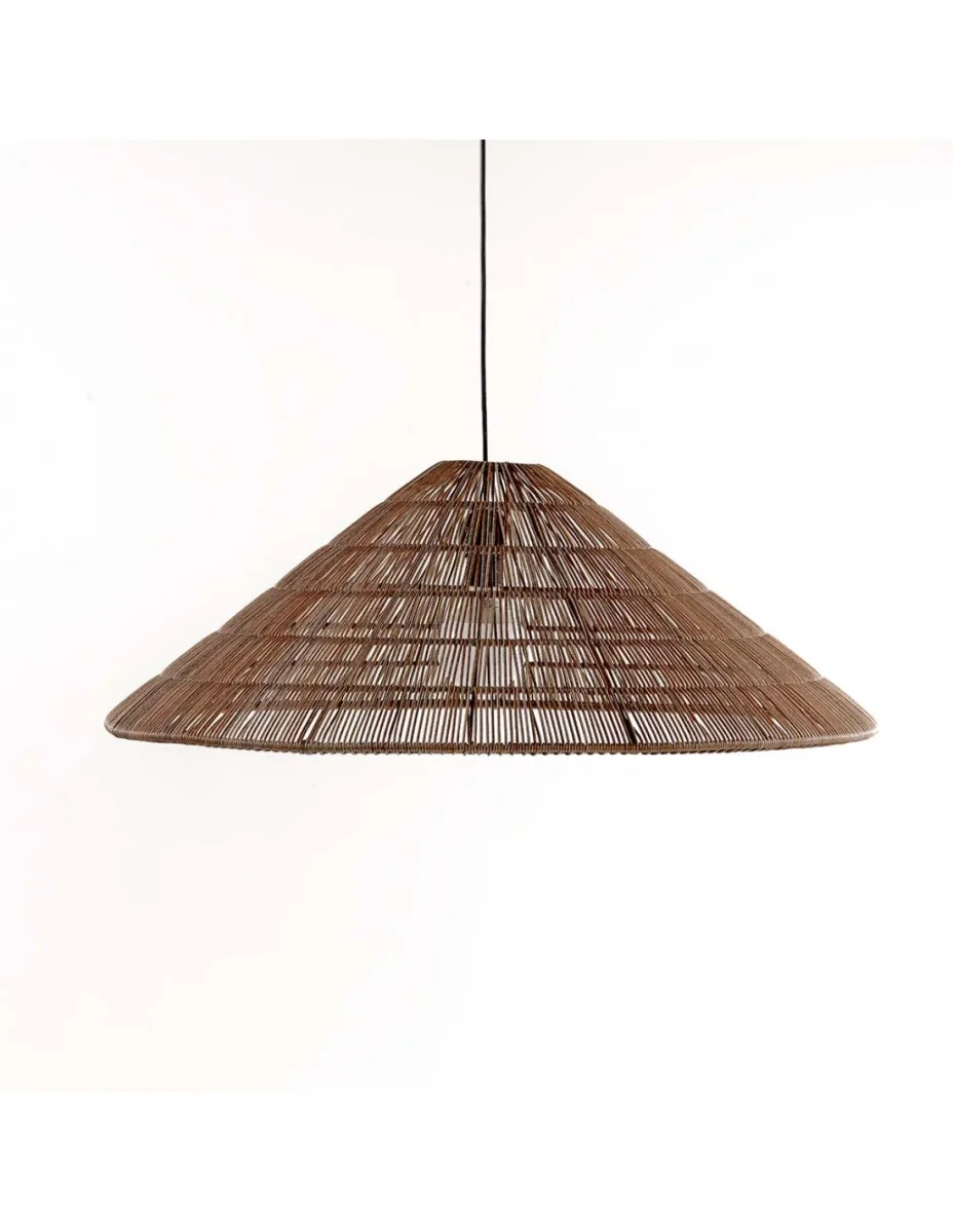 Pantalla de ratán sintético con forma cónica: Apta para uso exterior en jardín, porche o terraza. Pantalla de bambú sintético en color lino. Destaca por su forma, ratán tupido y gran tamaño. Es una lámpara para espacios amplios gracias a sus dimensiones. Perfecta para mesas redondas o cuadradas de gran tamaño. No incluye bombillas ni casquillo. Se vende solo la pantalla. Dimensiones: 81x81x28