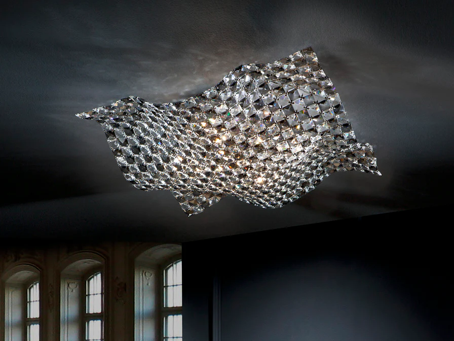 Plafón de 5 luces realizado en metal cromado y malla de cristales facetados K9. Cristales transparentes y smoke combinados.