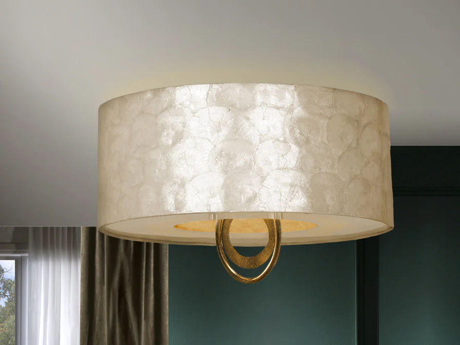 Plafón de 4 luces realizado en metal acabado PAN DE ORO y detalles en laca negro brillo. Pantalla con aplicaciones de láminas de nácar y difusor inferior.