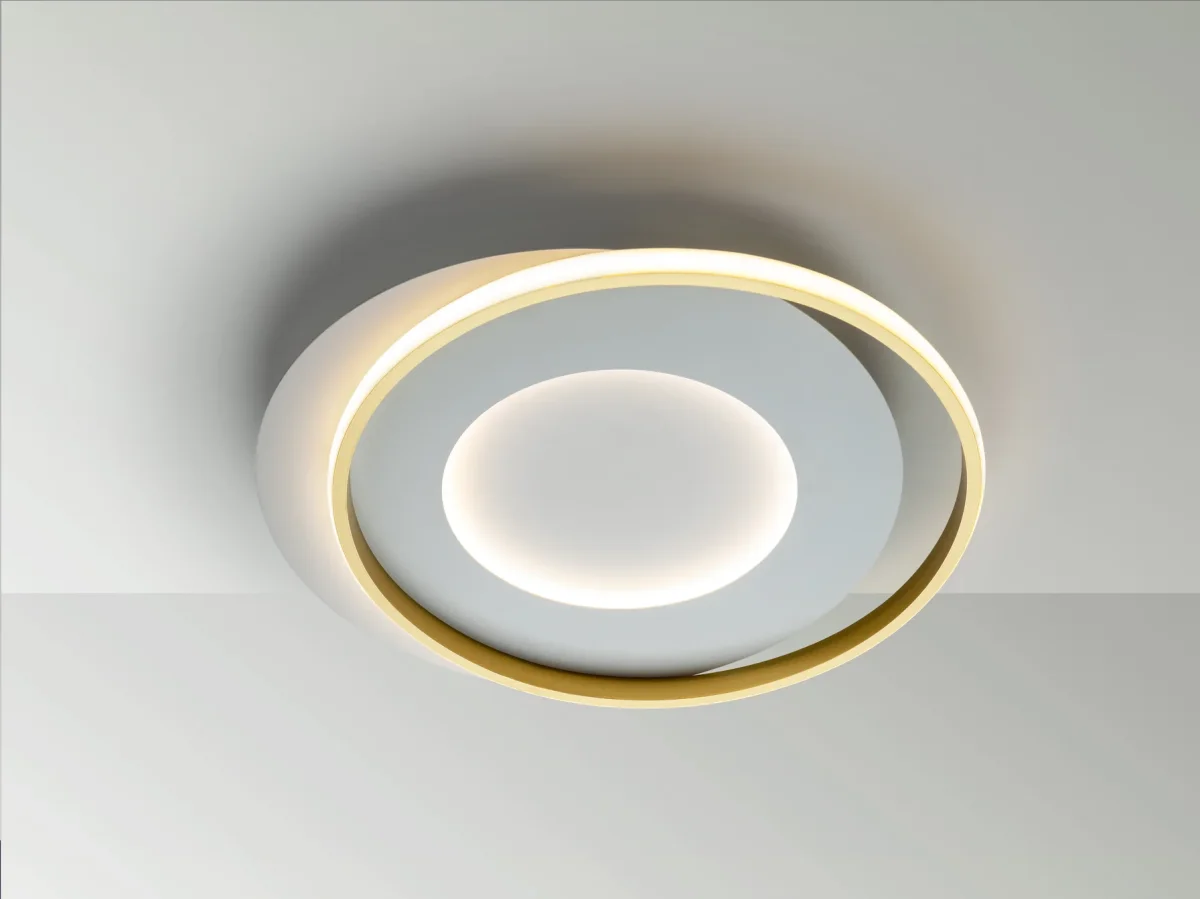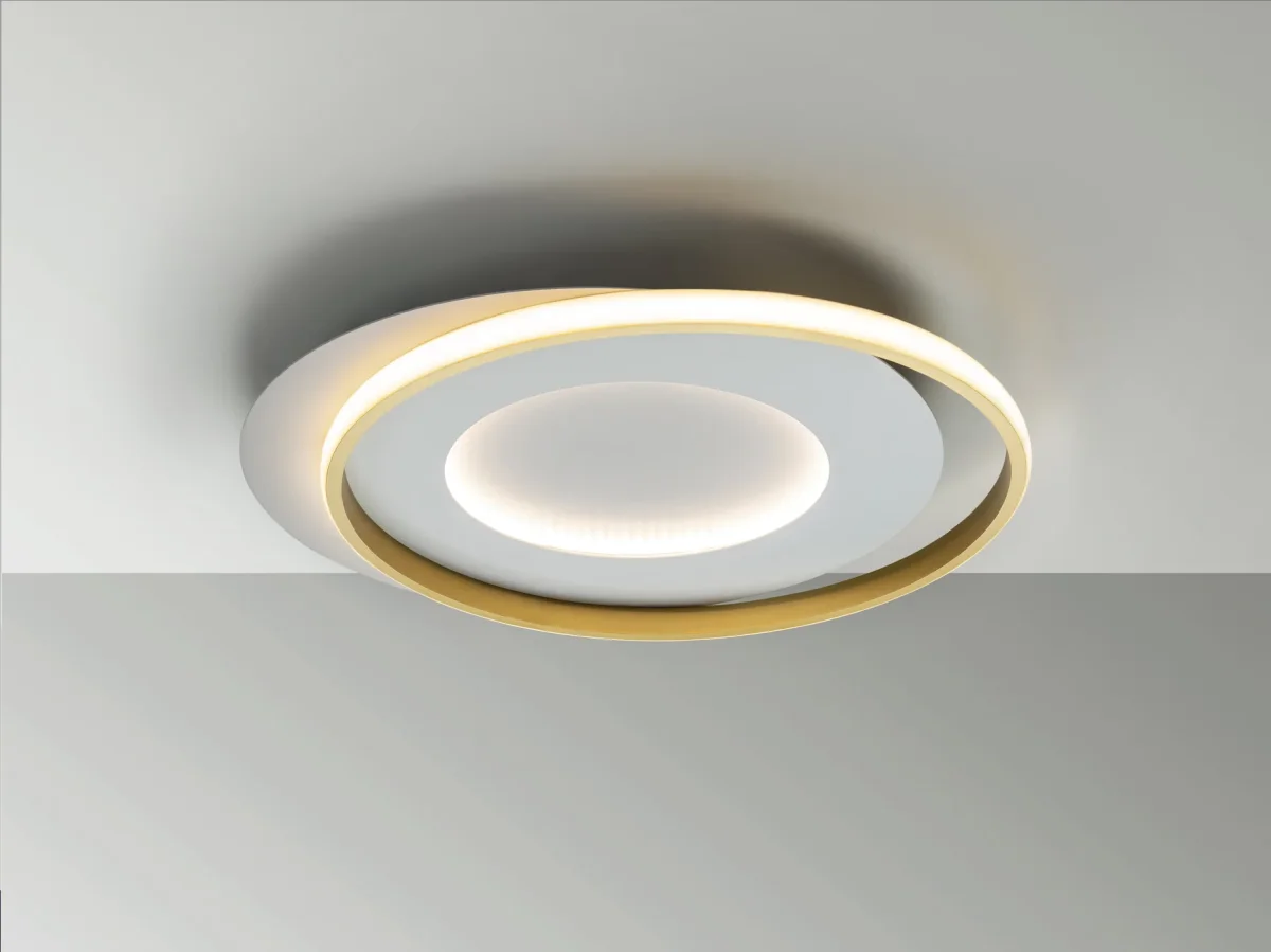 Plafón de techo realizado en metal y aluminio, acabado blanco mate y oro. Difusor opal de silicona. 40W LED. 4.400 lm. 3.000 K.