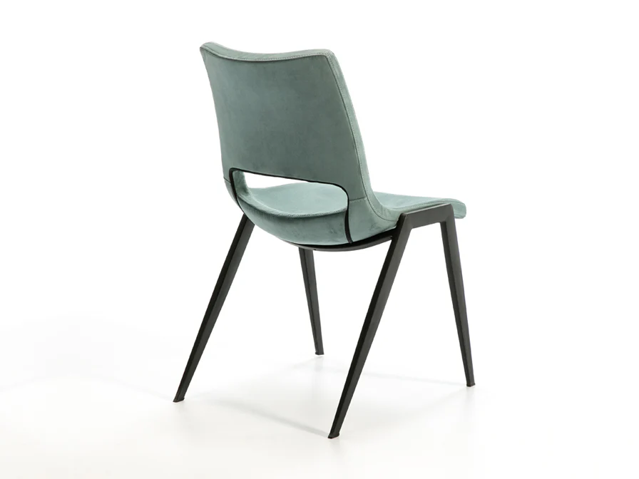 Silla realizada en metal, acabado negro mate. Asiento y respaldo realizados en madera contrachapada y espuma de poliuretano inyectada. Tapizado textil de gamuza hidrófugo poliester 100% de color azul aguamarina. Limpieza en seco.