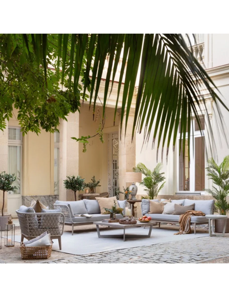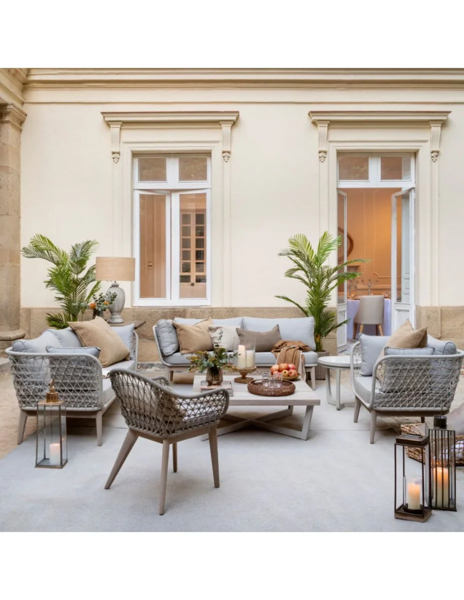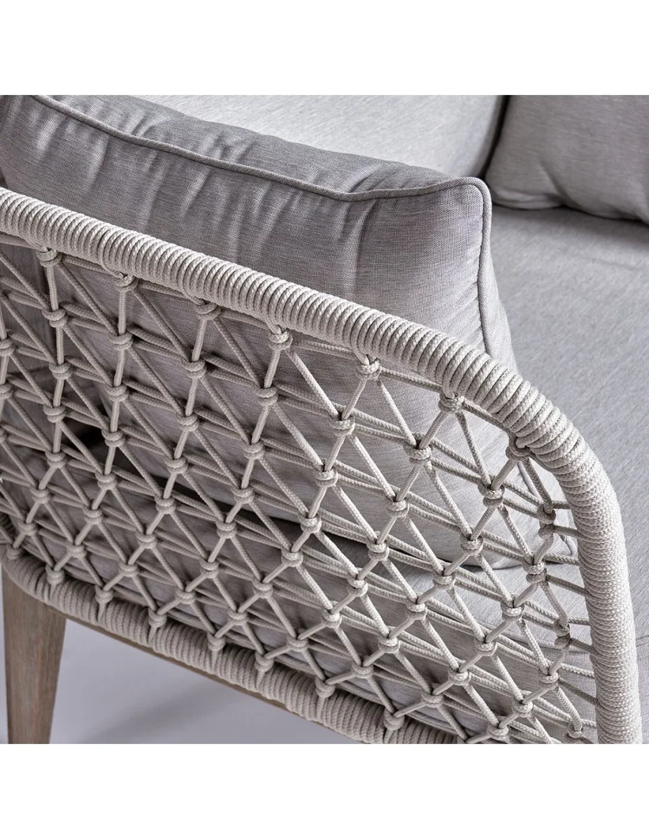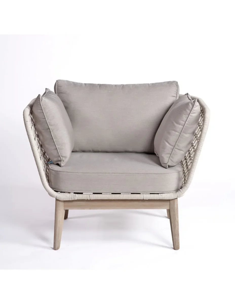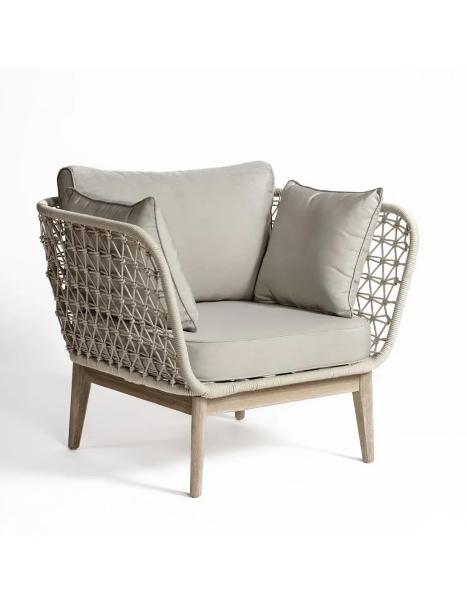 Sillón de una plaza para exterior: Fabricado en madera de eucalipto grisáceo y cuerda sintética blanca. Sus cojines ofrecen gran comodidad, mientras que su diseño armonioso aporta elegancia al entorno. Combínalo con otros muebles de la colección OSANA en color blanco grisáceo para crear un conjunto completo. Incluye solo un cojín pequeño decorativo. Dimensiones: 95x77x73