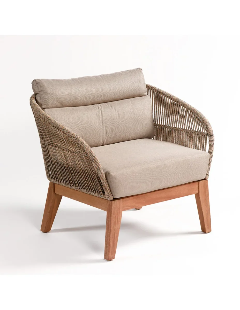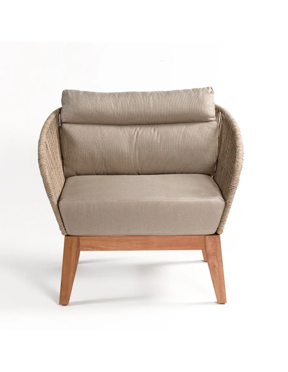 Synthetic Rope Armchair: Looking for something different for your garden or terrace? Introducing this wonderful armchair with natural wood legs and synthetic rope. Ideal for decorating any area of your home as it perfectly matches any decor. Comes with a padded cushion for added comfort. Combine it with our sofa collection to create the perfect atmosphere. Dimensions: 83x77x71.5