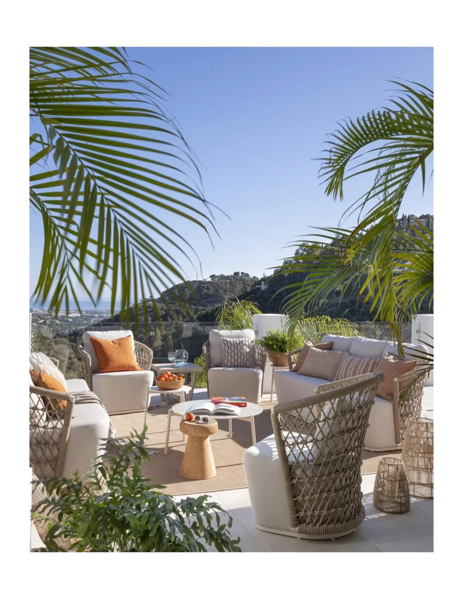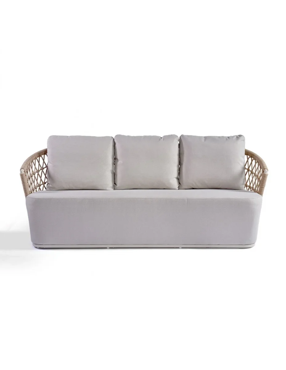 Sofá de cuerda y aluminio para exterior: Moderno sofá con estructura de aluminio en color blanco ivory y respaldo de cuerda natural en forma de red. Cojines aptos para la intemperie. Dimensiones: 221x87x81.5