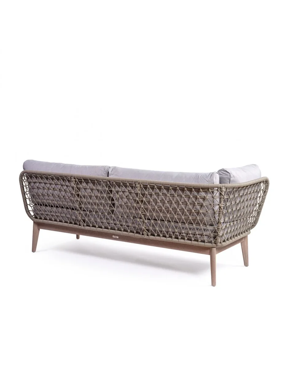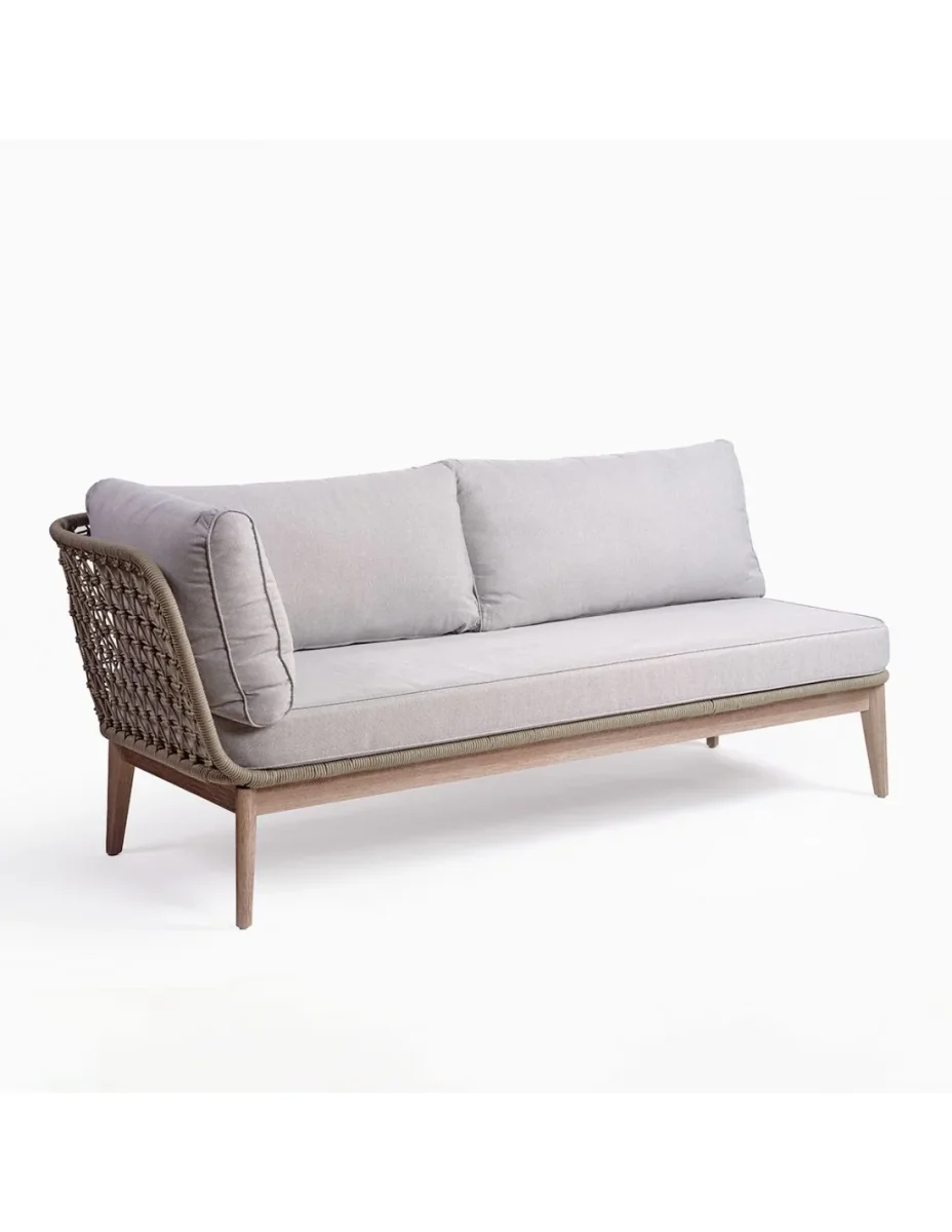 Sofá de exterior con pata de madera de eucalipto grisácea y cuerda sintética en color cemento: Con un solo brazo en el lateral, puede utilizarse como pieza individual o combinarse con el modelo OSANA-1C para formar un sofá de esquina. También disponible en color blanco grisáceo. Dimensiones: 191x77x73