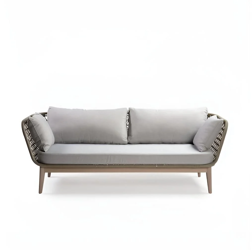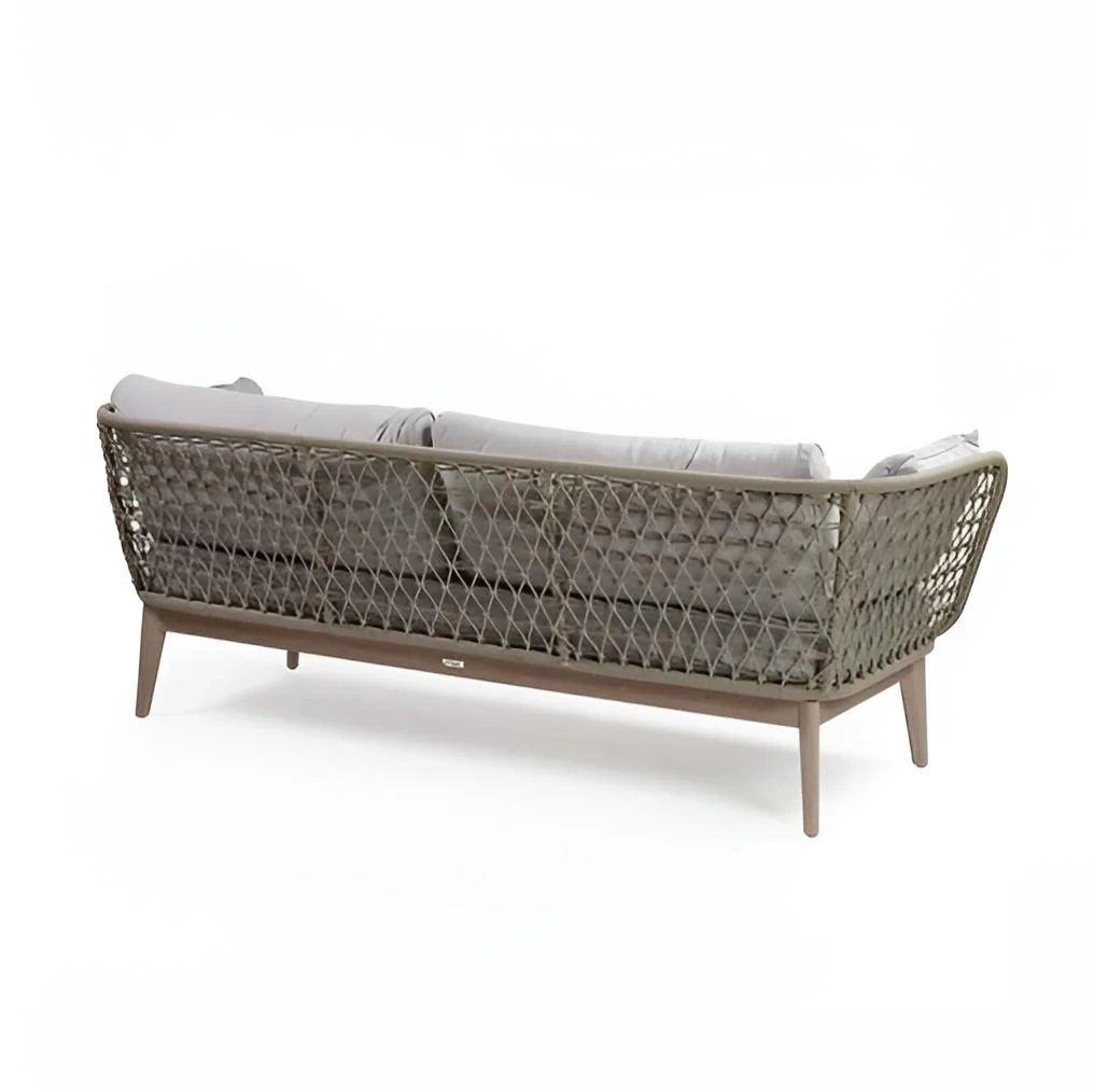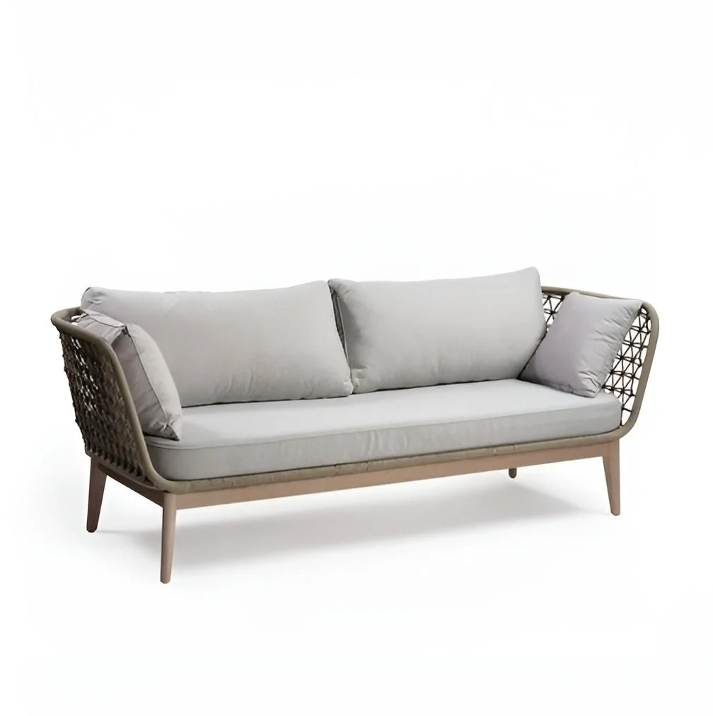 Sofá de exterior con pata de madera de eucalipto grisácea y estructura de cuerda sintética en color cemento: Incluye cojines tapizados en el mismo tono. Puede combinarse con el modelo OSANA-2C para formar un conjunto en esquina. También disponible en color blanco grisáceo. Dimensiones: 202x77x73