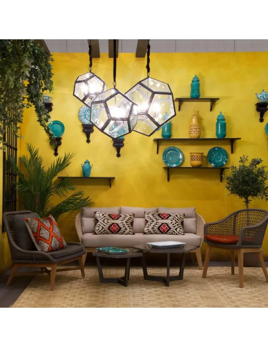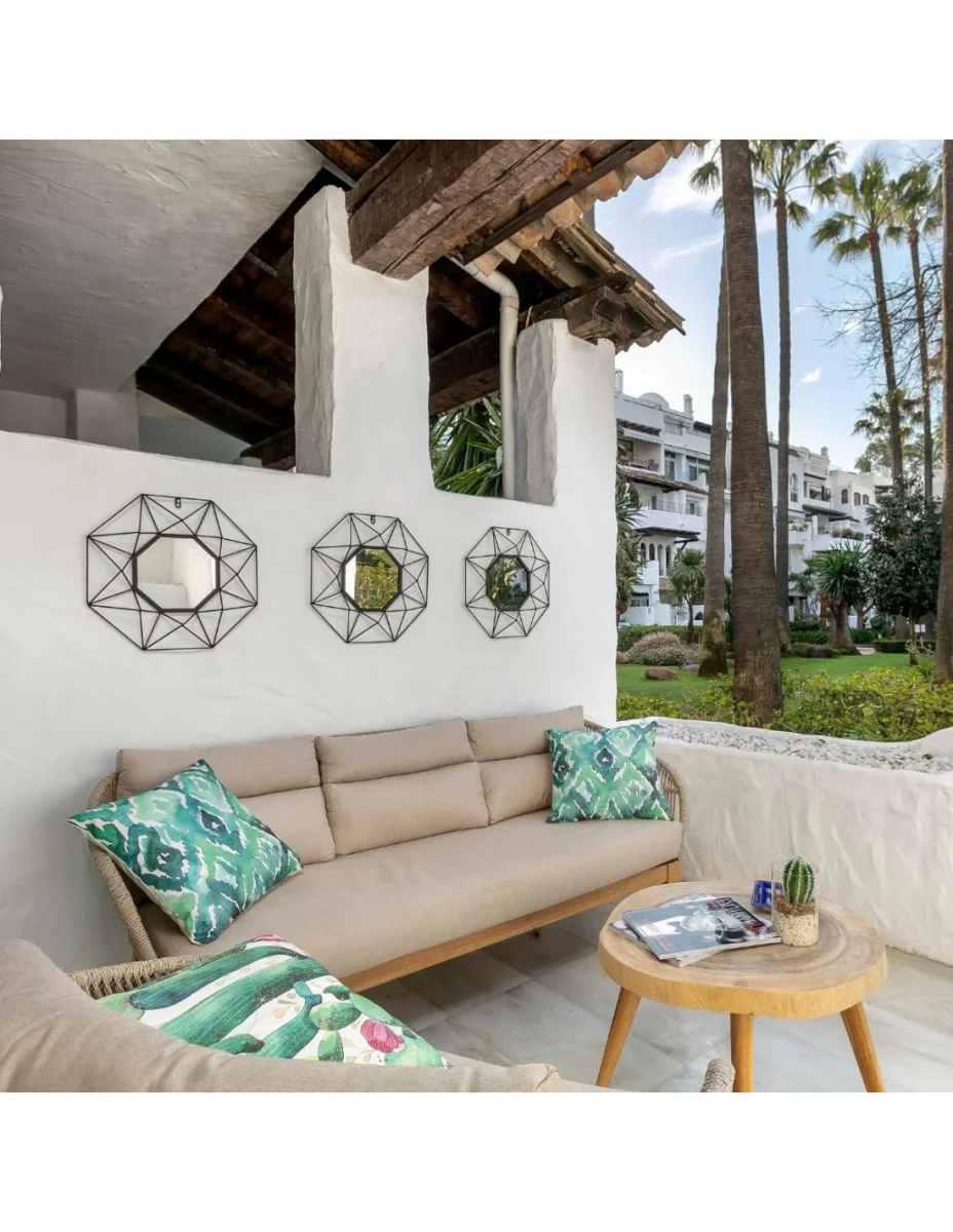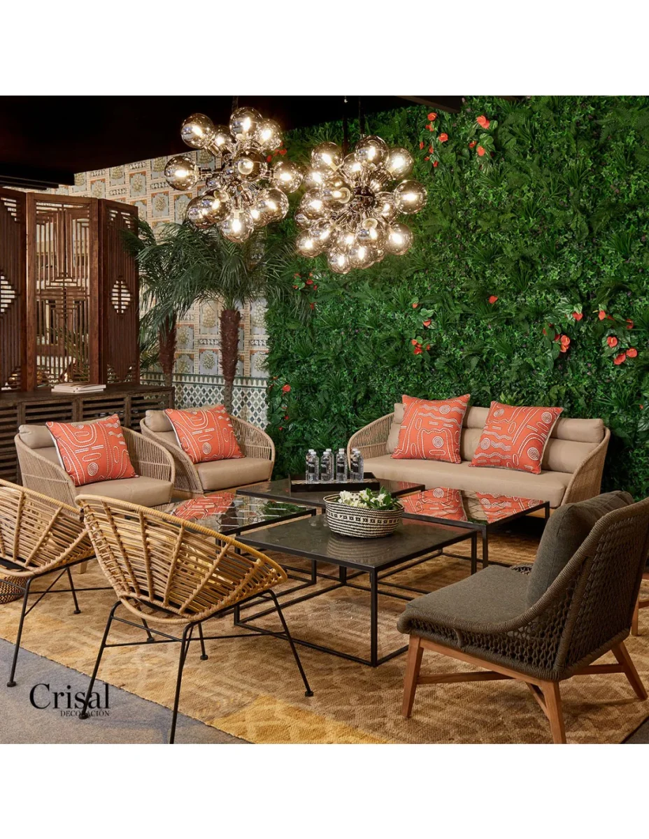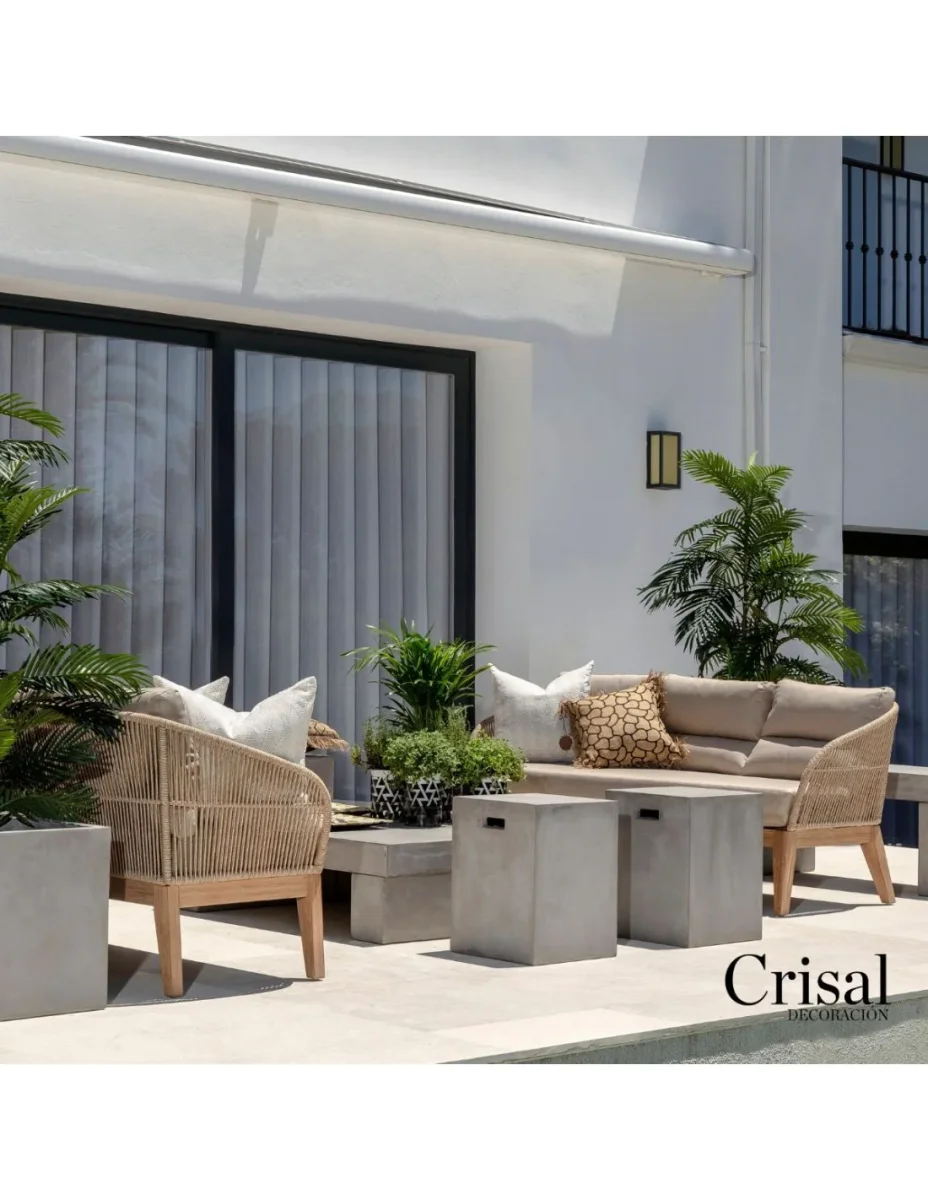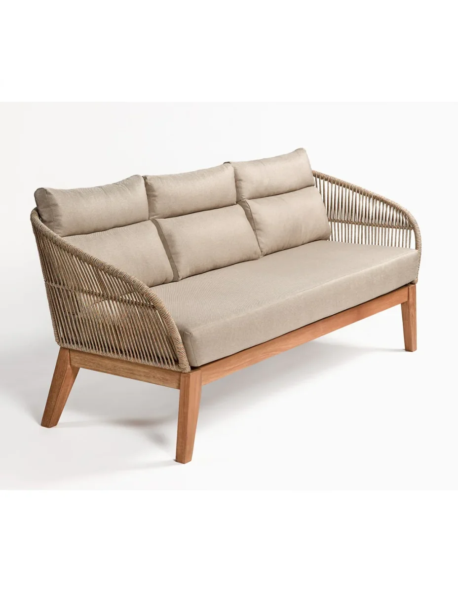 Wood and Rope Sofa: Beautiful 3-seater garden sofa, generously sized for your moments of relaxation. Made of synthetic rattan, accompanied by a mattress and 3 back cushions for added comfort. This raw-looking sofa will perfectly match the armchair from the same collection. Dimensions: 175x77x71.5