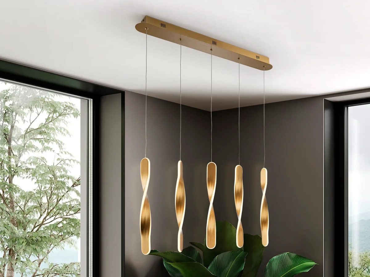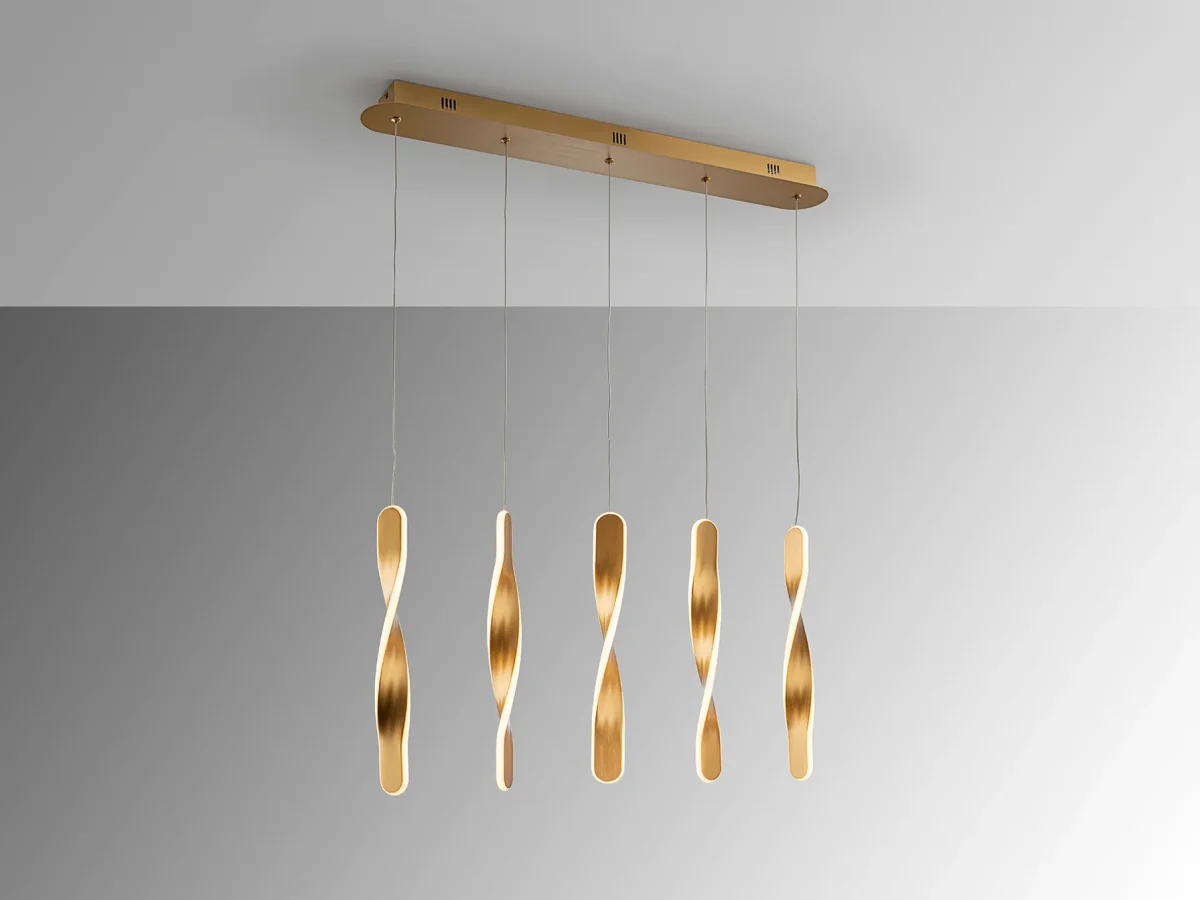 Lámpara de 5 luces realizada en metal acabado oro cepillado. Difusor de silicona opal. 50W,3400 lm, 3000k. DIMABLE
